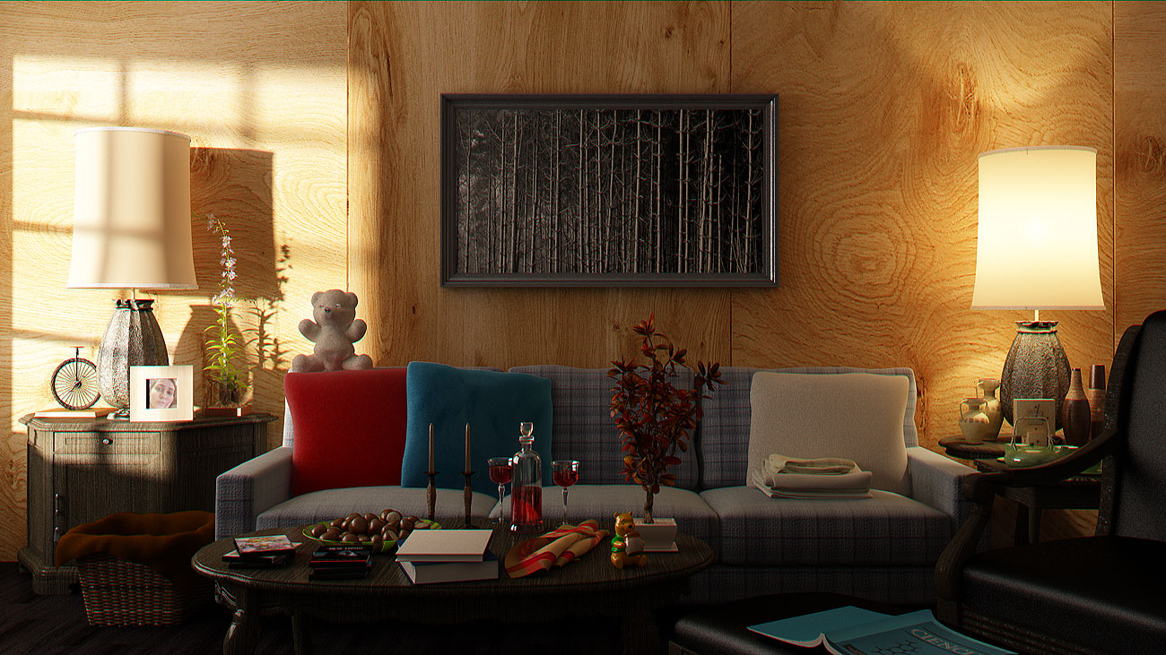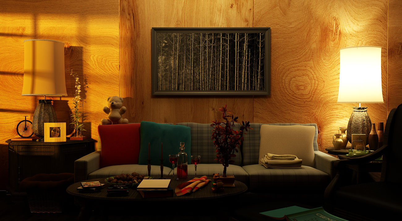 Muy buena la escena del sofá, me gusta la iluminación y la atmósfera creada, el texturizado muy bueno. Muy buen trabajo para el primer mensajes.