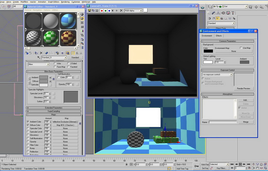 La escena tiene cuatro materiales, con un chequer de diferente color en el difuso y en todos los materiales tiene asignado un AO en el canal de ambient color y como vez en el ambiente el color está bastante claro con lo que la escena se ilumina bastante y ni por asomo hace el mismo resultado.