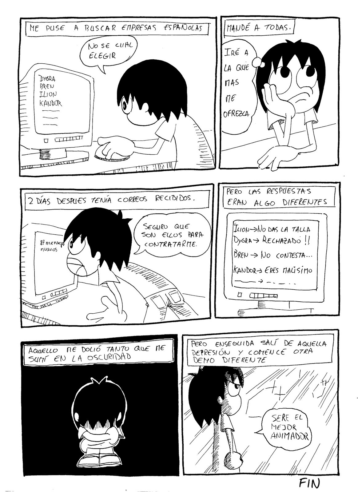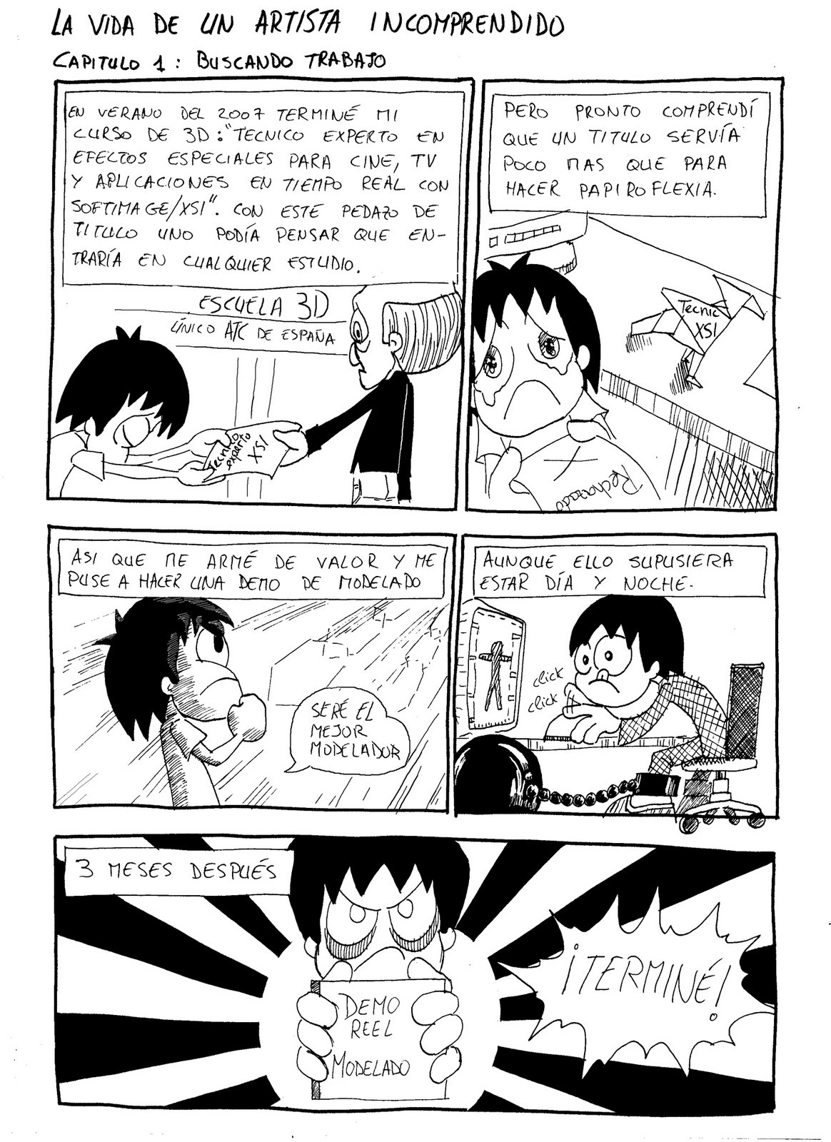 Yo la primera reel que me hice no tubo demasiado éxito y cuando empecé a hacerme la segunda me llamaron de un estudio de infoarquitectura y desde entonces sigo aquí. También hago algún que otro curro de freelance, hago todo con XSI, aunque este programa no es la mejor opción debido a su poca extensión, casi siempre me piden max o Maya. Gracias por leer mi cómic.