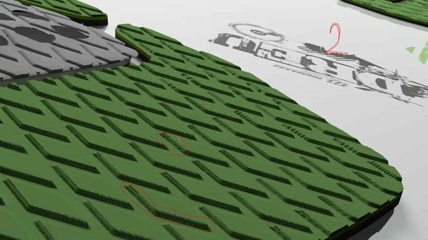 Hola, estoy haciendo una tabla de kitesurf y el pad, como es una especie de rejilla, lo hago con un displacement map, (adjunto la imagen del mapa), pero no sé por qué salen unos surcos cuando el mapa esta a bastante calidad. (imagen 2).