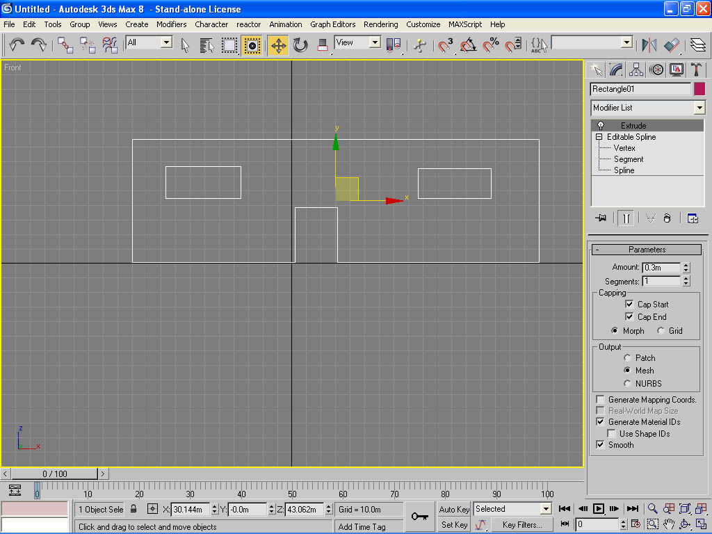 5) aplica a la Spline editable el modificador extrusión con el valor que quieras. Yo he aplicado 0,30, que es más o menos lo que mide un cerramiento tradicional (bueno, vale, son 0,28, pero me gusta redondear).