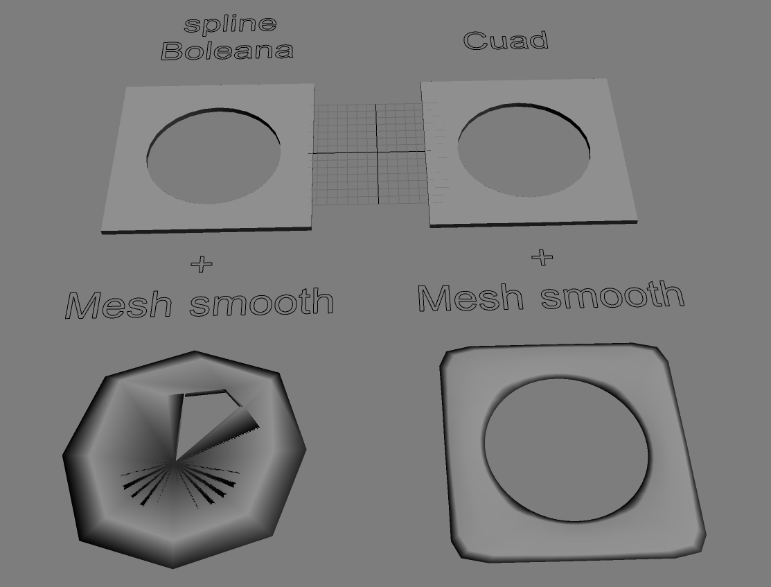 Mira aquí te pongo la prueba de cómo max, trata al final de la misma forma la booleana Spline. Como ves los dos objetos son iguales, con la diferencia de que uno está hecho a partir de una Spline y el otro a partir de un Quad.