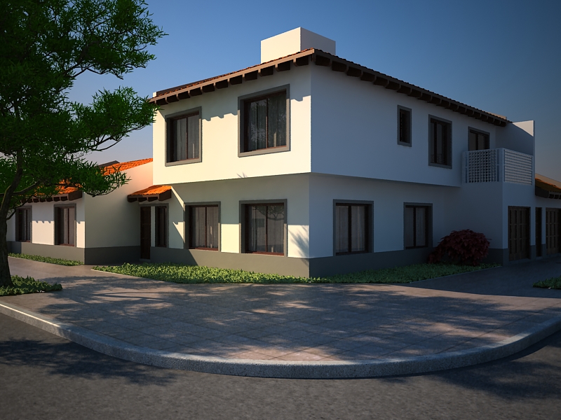 Hola, que buen trabajo, la iluminaciones está muy bien conseguida, y bueno como te comentaron anteriormente, tendrás que revisar el pasto se ve muy raro y bueno creo que también, las tejas las veo muy pequeñas, pero lo demás está muy bien.
