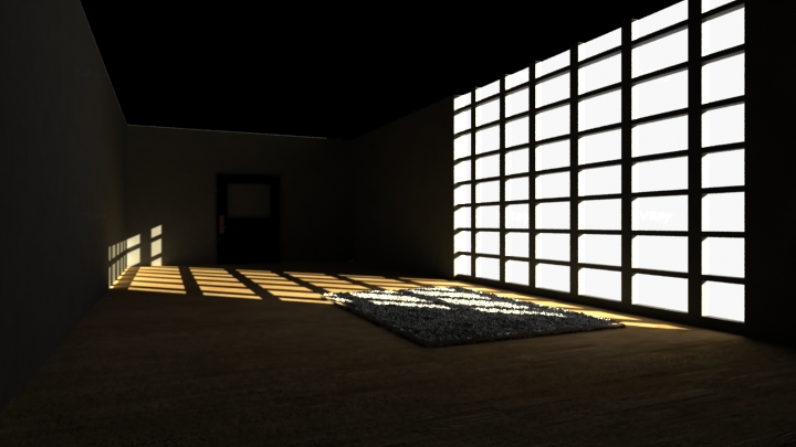 Hola gente, estoy incursionando en esto de usar iluminación indirecta y que la luz refracte entre objetos, en fin, es una escena muy simple, hay una alfombra echa con Vray displacement mod una puerta sin textura, un piso de parque con Bump y displacement con material arquitectónico, y una luz omni es una Vrayshadows, y un ventanal sin vidrios ni nada, las cáusticas están desactivadas.