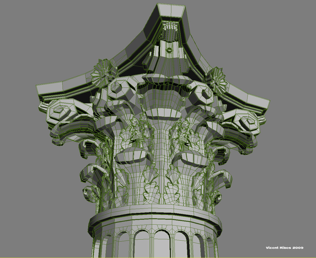 Hola. Estoy modelando un capitel corintio y como no me atrevo a meter más polígonos, los nervios de las hojas de acanto pensaba hacerlos por material o desplazamiento (igual es que ya sobran muchos polígonos, pero no he sabido hacerlo mejor) l.