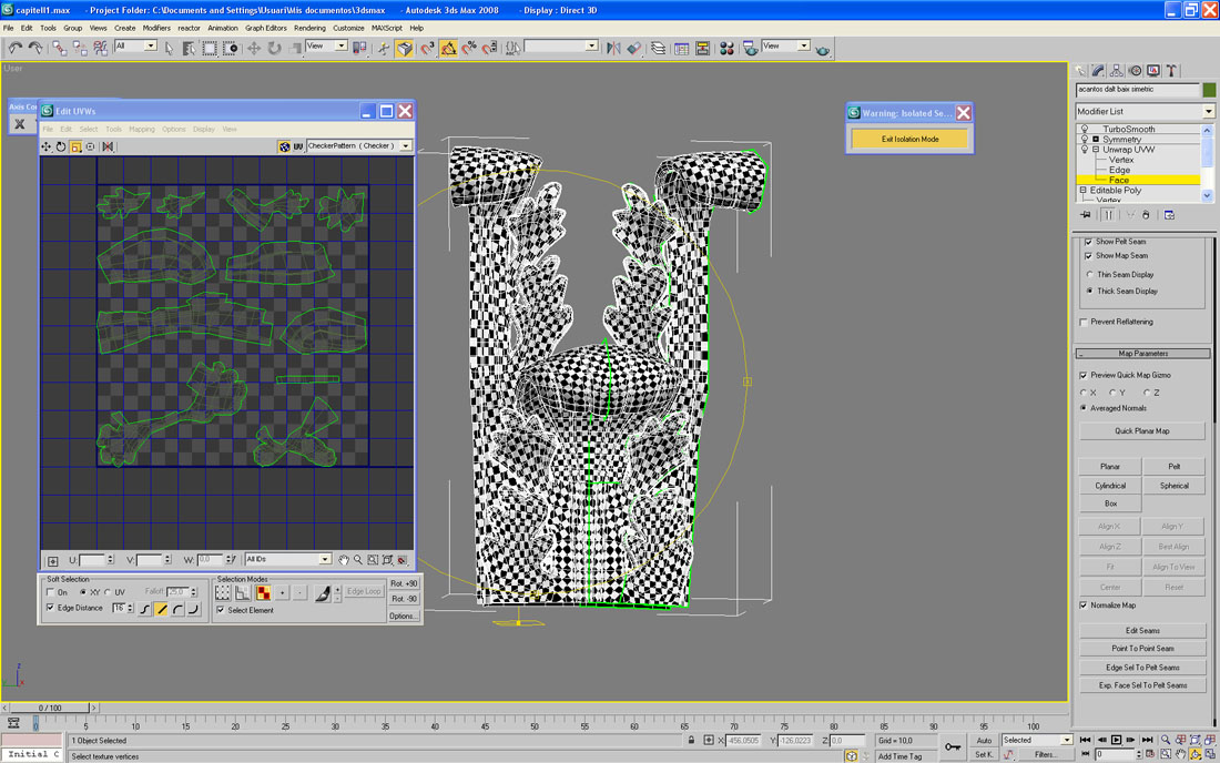 Wayfa gracias, hay zonas en que el mapeado plano quedaba bien, pero como en las zonas donde se curva la malla es difícil crear costuras, lo voy haciendo todo con Pelt. A ver qué pasa con las volutas, por lo menos parece que no voy muy desencaminado, gracias a todos.