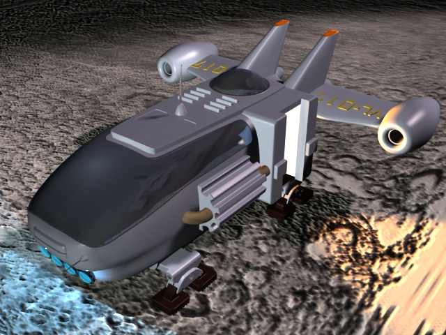 Bueno van 2 imágenes más generales desde otra perspectiva. Luego subo la malla y vistas ortogonales. La iluminación era buscando crear un entorno espacial, jugando con la luz ambiental, la interna de la nave y las frontales del vehículo, pero claro me estoy adelantando, hay que verlo bien antes de iluminarlo.