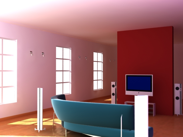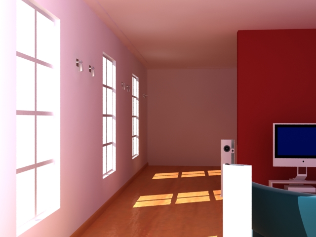 Subo dos fotografías. En la primera le baje la recepción de GI a la pared roja y en la 2º a las otras paredes, en ambos casos les subí las subdivisiones a las Vray planas de las ventanas.