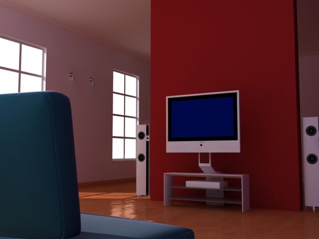 Vas mejorando en la iluminación, personalmente me gusta más oscuro, prefiero que haya buen contraste entre la zona iluminada directamente desde las ventanas con la parte más sombría del interior si no hay luz artificial. Debes controlar un poco el color bleed para que se tiñan menos las paredes por los rebotes sobre ese rojo (en system, selecciona, por ejemplo, las paredes y baja la recepción de GI). Saludos.