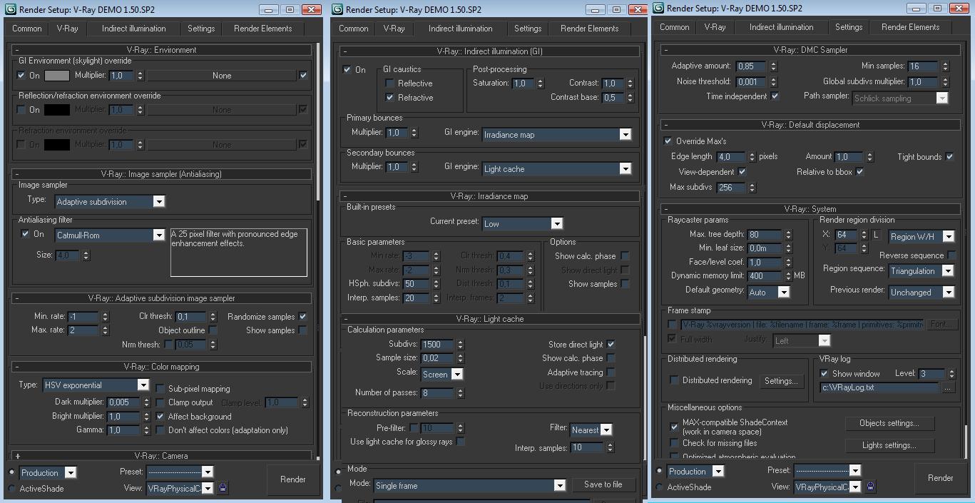 No estas usando para iluminar Vray Sky puesto que tienes activado el environment en Vray con un color. Los valores de Color Mapping Hsv exponencial y dark 0.005 son los más extraños que he visto y son incorrectos también. En los demás parámetros también hay muchas incongruencias. Hay demasiada ayuda por ahí y deberías empezar por ella antes de tocar parámetros sin saber que hacen o que efecto provocan en el render.