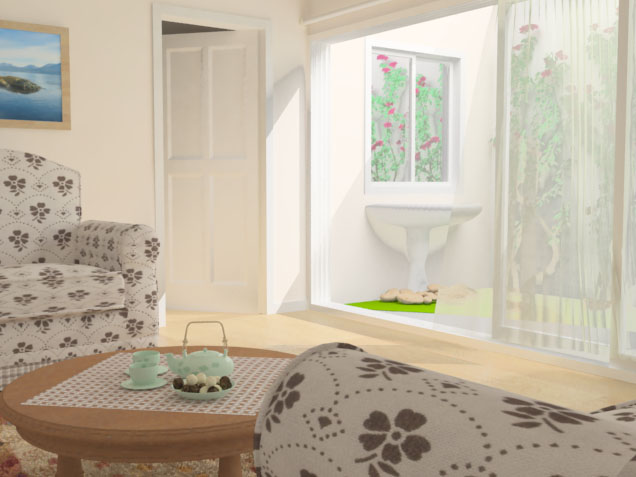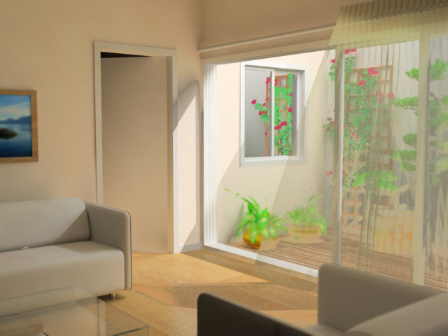 Mucho mejor. L enredadera sigue siendo fluorescente, igual que el césped. El sofá queda muy bien, pero la textura se ajusta mal a algunas zonas del cojín. Repasa el Wrapeado del mismo. La puerta corredera se desplazaría por un carril ¿no? Pues haz el carril porque simplemente la has puesta encima de un rectángulo y canta. En cuanto arregles esos detalles estará mucho mejor.