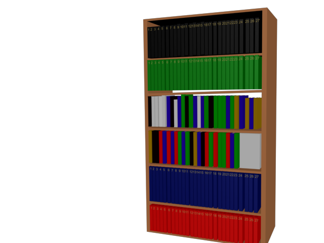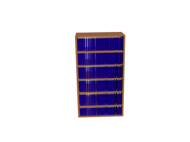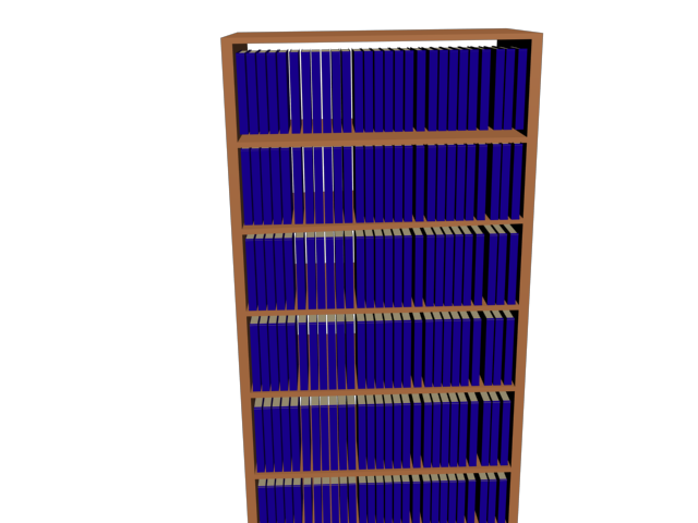 Un pequeño trabajo en 3d es esta estantería con libros que estoy modelando. La estantería ya está echa (la hice con dos box convirtiéndolos a Editable Poly y usando Bridges), pero ahora me faltan los libros, la parte más difícil, especialmente por el texturizado.