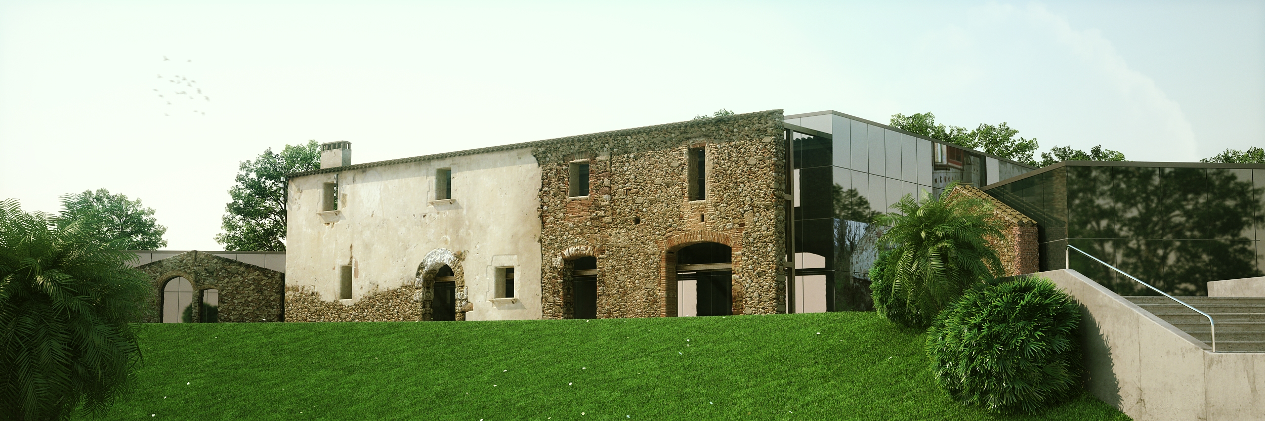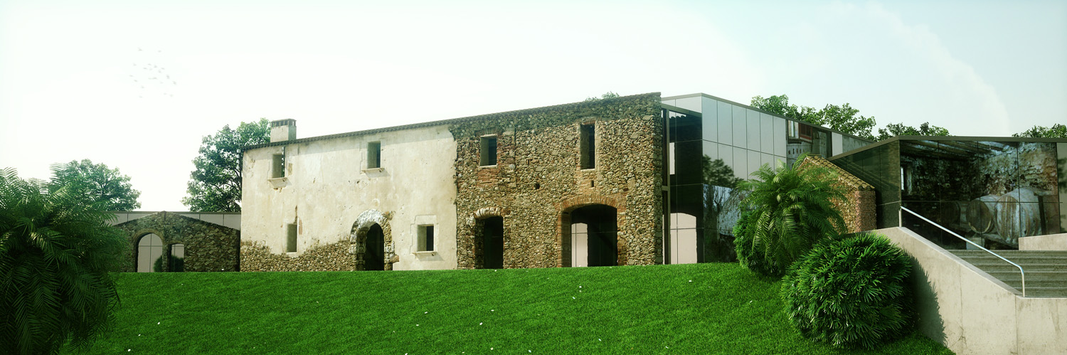 Buenas. Aquí un trabajo de arquitectura un poco diferente. Es una Masía (casa de payés catalana) que estaba muy deteriorada. Se urbaniza la zona, la Masía vieja queda al lado de la carretera, los promotores quieren crear un gran espacio polivalente en la zona. El ayuntamiento considera que unas fachadas de la Masía no se pueden tocar pues tienen interés arquitectónico.