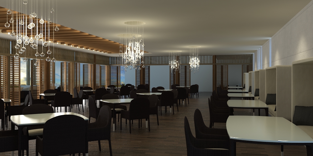 Este render que has colgado está mucho mejor, me latió como te quedaron las lámparas y sus destellos de luz apenas apreciables, típico de un atardecer, quizás algo de ambientación extra en algunas mesas para algo de más realismo.