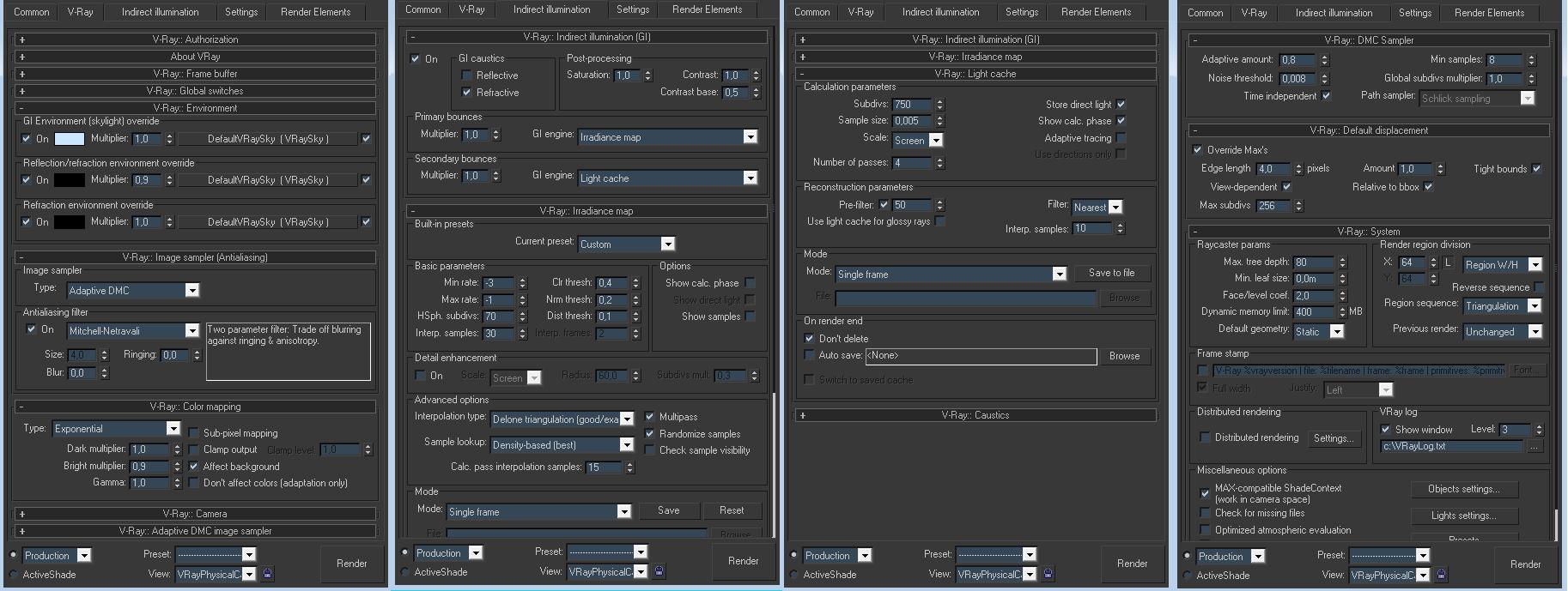 Pues utilizo 3ds Max 2009 y Vray, Vray Sun y Vray Sky, estos son mis parámetros. Lo que quiero conseguir es que en los rincones se vea la sombra más oscura, pero sin cambiar las áreas de luz.