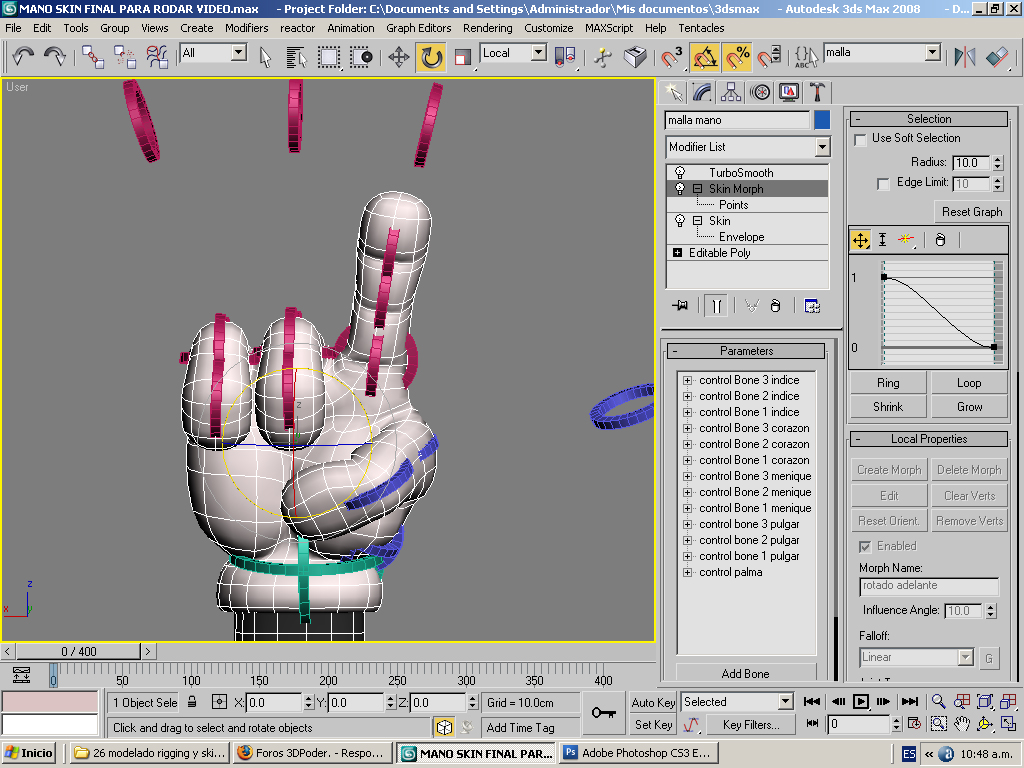 Estoy skineando la mano de la imagen y después de pesar vértices he querido utilizar el skinmorph por primera vez, antes me he leído la ayuda y visto los videotutoriales de Autodesk y Digital Tutors.