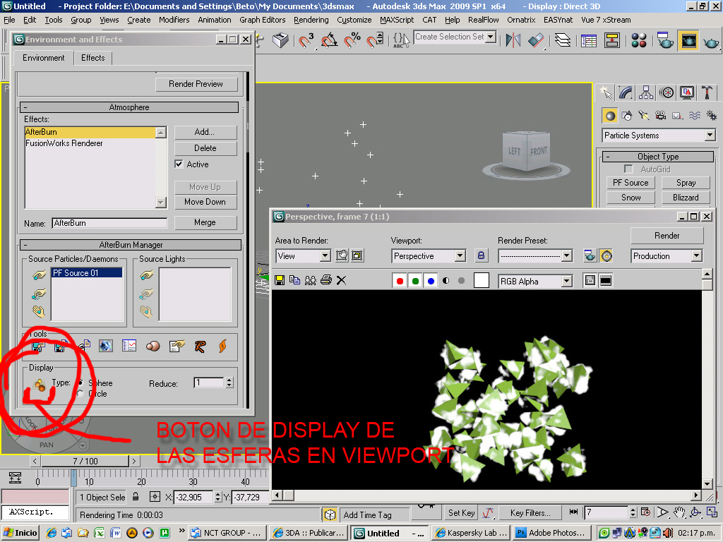 Para que no te salga el shape del Particle Flow o no le debes poner o apagarlo o poner en display en dots o thik o cualquier otro que no sea geomety, y con respecto al display a mí también lo que me coste encontrarlo, lo escondieron lo camuflaron muy bien, y ni siquiera al botón le pusieron una sombra, a continuación, te adjunto la captura de dónde está el botón. Saludos.