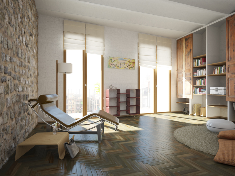 Hola, me falta pulir algunos materiales y añadir algún detelle más para acabar este trabajo. Es un piso en el raval de Barcelona, en un edificio antiguo que ha sido reformado. Saludos.