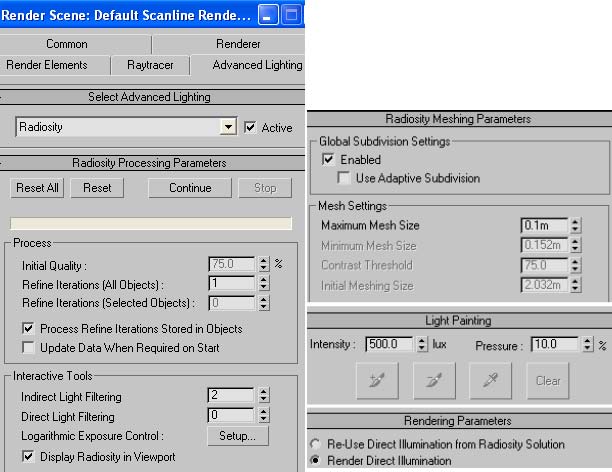 En el fichero advanced lighting, desplegamos la lista y escogemos radiosity, y ponemos los parámetros que ve: