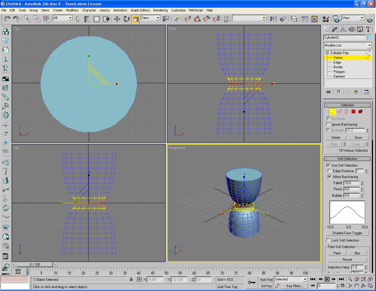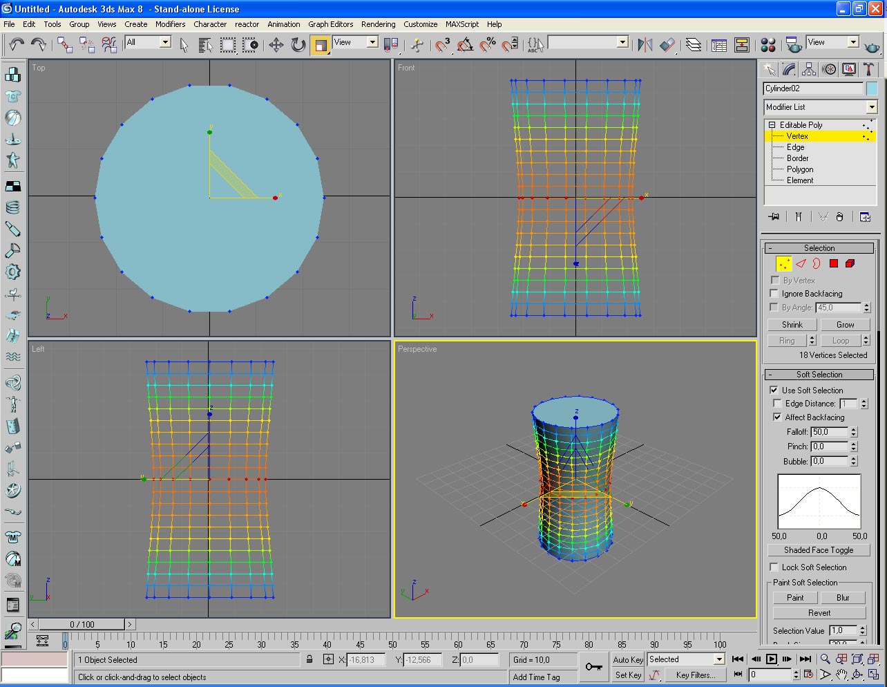 Selecciona los vértices de la línea central de tu cilindro, veras que los vértices también se seleccionan, con diferentes colores. Prueba con el valor del fallof hasta que los vértices más alejados se pinten de azul celeste [en mi caso 50], en la vista perspective aplica la herramienta escala a los ejes X e Y, no mucho, disminuye el valor de fallof [en mi caso 40] y vuelve a escalar ligeramente. Fíjate en las vistas front y left para controlar la forma que va tomando el cilindro. Baja el fallof a 30 y dale un efecto escale más pronunciado, baja el fallof a 20 y vuelve a escalar, pon el fallof en 10 y estrecha el cuello del reloj con scale.