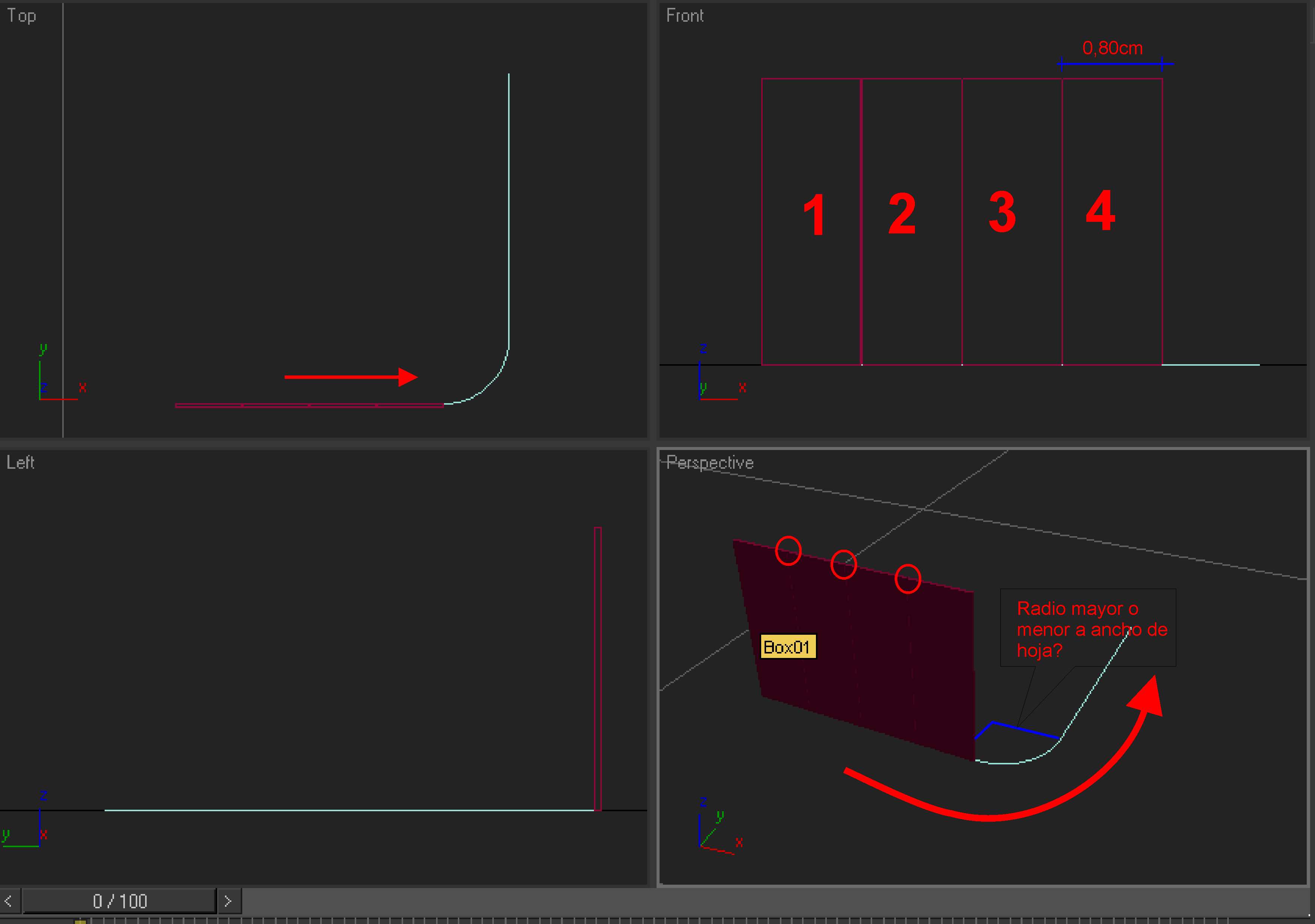 Se trata de realizar la animación de un portón corredizo (adjunto imagen para mejor comprensión). El portón consta de 4 hojas de 80cm c/u y debe desplazarse sobre una guía que en una parte se curva.