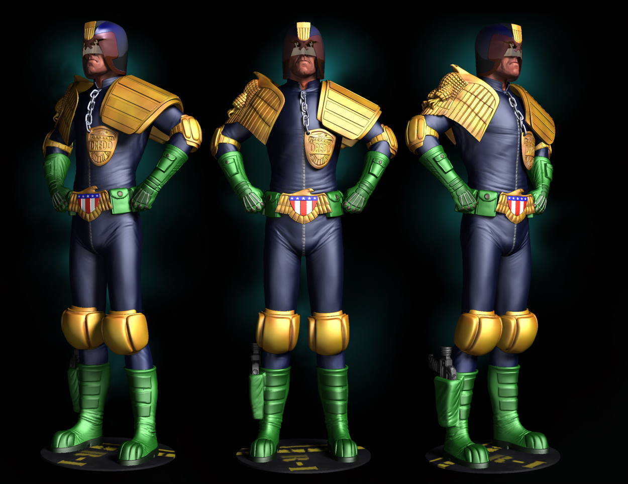 Está muy bueno el personaje y modelado, al igual que las texturas, dan un toque de cómics. Muy bueno, una pregunta ¿es tan grande la chapa que lo identifica? Porque vi la película del juez Dredd y no recuerdo una chapa tan grande, o ¿es así en el modelo que dibujó Brian Bolland? Simple curiosidad. Excelente en verdad.