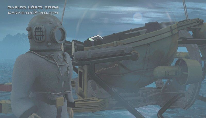 Es que tengo el defecto de hacerlo todo demasiado oscuro. Bueno es un batiscafo español. Le estoy preparando un entorno, con infinidad de mecanismos, cables, aparatos, el buzo dentro, nuestra bandera.