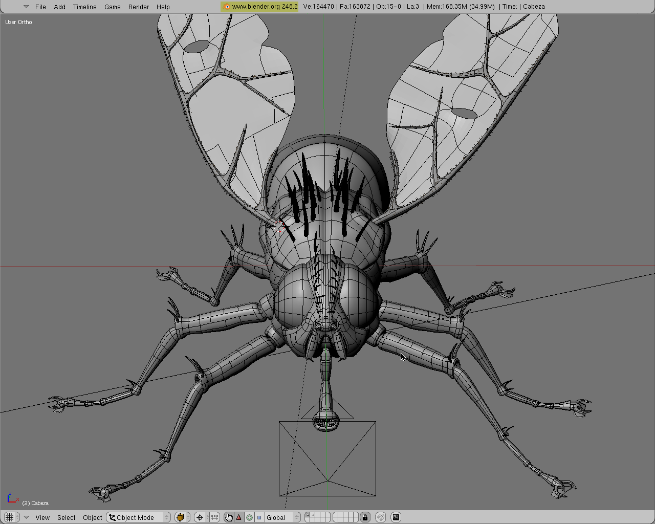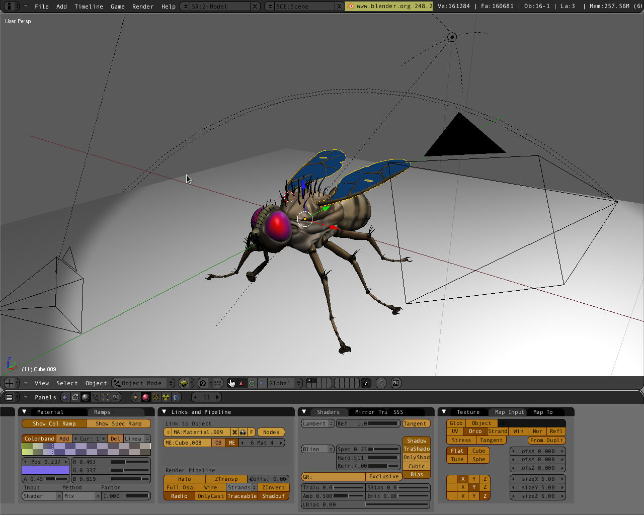 Yo pondría un escenario provisional, con dos simples planos, mapeado con cuadros de ajedrez a dos colores, para que haga de fondo del modelo y sobre todo de la transparencia de las alas.