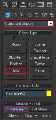 2.-teniendo seleccionado el shape rectangle, me voy a compound objects > Loft > get Path, y picas en el shape del tipo line.