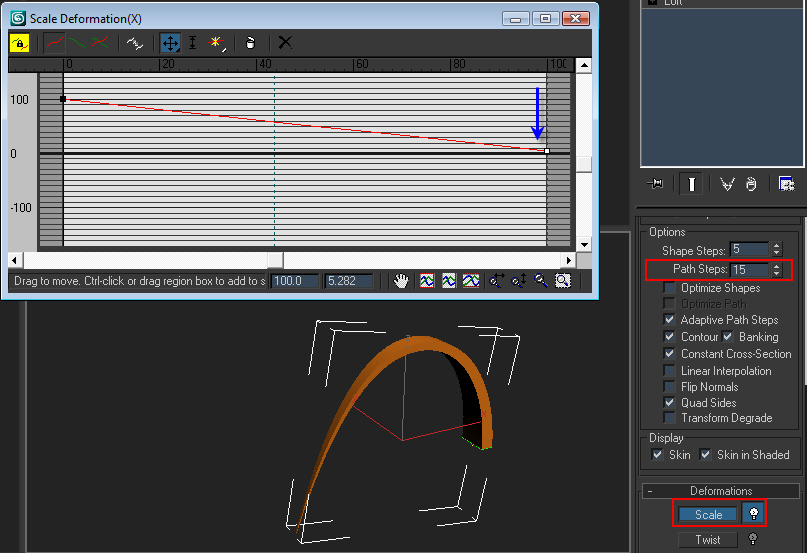 3.- Te aparece una nueva forma, seleccione esta, y te vas al panel modify (puedes mejorar la calidad, modificando el shape o Path step), te vas al ut Deformations y le das a scale, en esa nueva ventana, mueve los nodos para que obtengas el resultado deseado.
