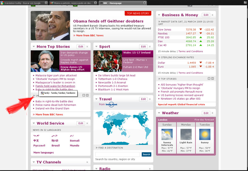 Buenas. En la imagen que adjunto la flecha roja señala un pequeño truco, que se muestra cuando dejo el cursor quieto sobre una palabra en inglés. Entonces, aparece la traducción al castellano.
