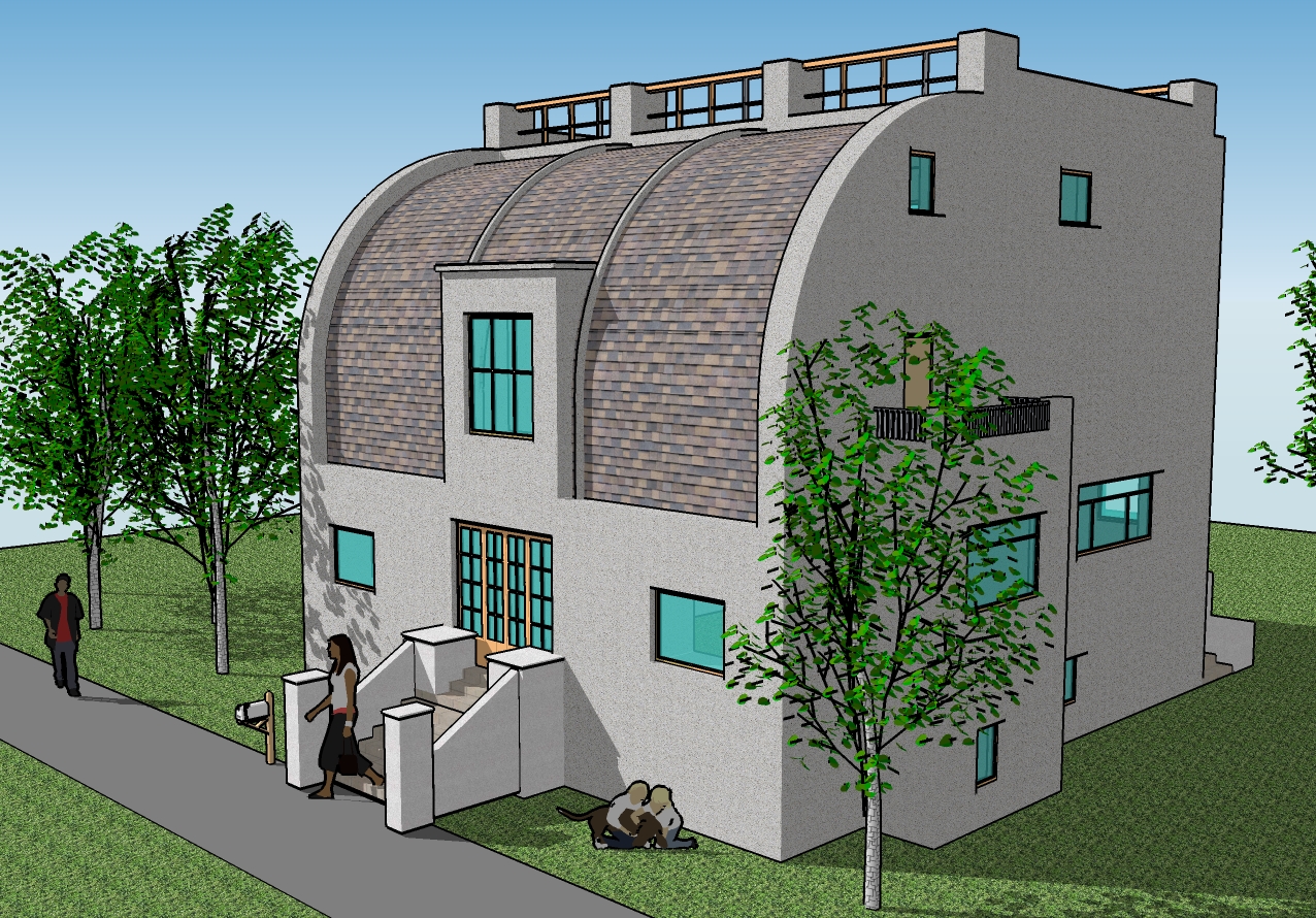 Vos la modelaste hacia adentro, como encajonada en los muros laterales y el de la fachada, y si te fijas en las fotografías el loco pone la cuebierta por fuera de estos y además el color es bien negro, contrastando fuerte con el blanco de abajo.