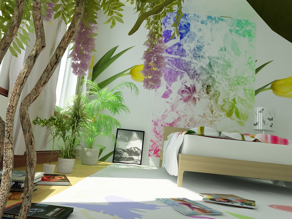 Y cómo detalle, que ya sea árbolito o arbusto (dado que no veo su base) que ubicas dentro de la habitación con floración, obviamente no sería real, dado que al tener floración vá si o sí, fuera de un ambiente cerrado, nada más que eso, y te felicito muy buen trabajo. Saludos.