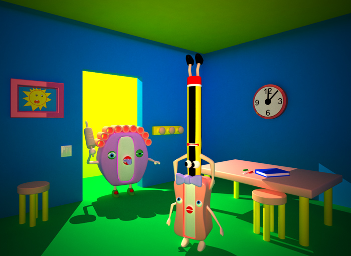 Hola, si los materiales son inexistentes, es marca de la casa. La verdad es que los personajes los terminé el año pasado. Esta mañana me he levantado con ganas y he primitiveado el escenario en poco tiempo. Luego le he metido las luces, render y al horno.