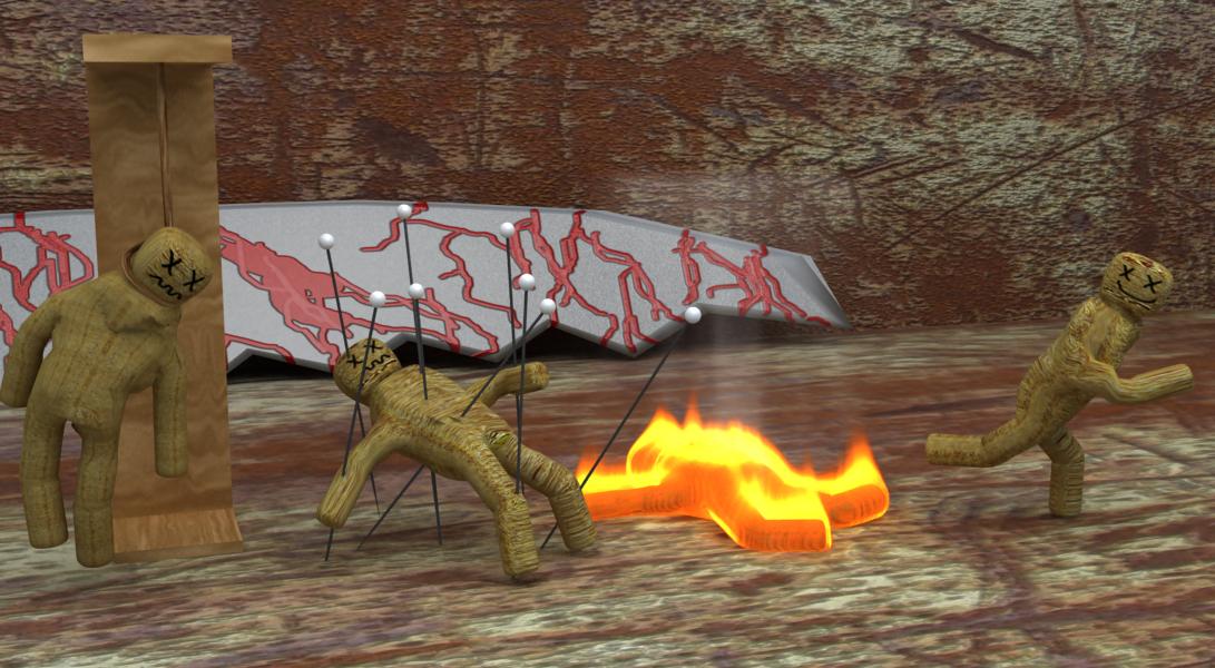 Si no lo entendéis se trata de 3 muñecos vudu que están muertos y uno se escapa es como más o menos como el de la imagen del plato de las monchetas.