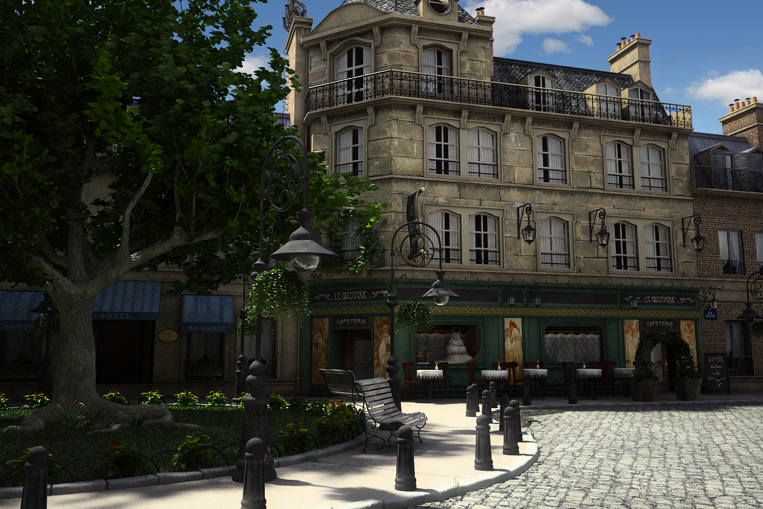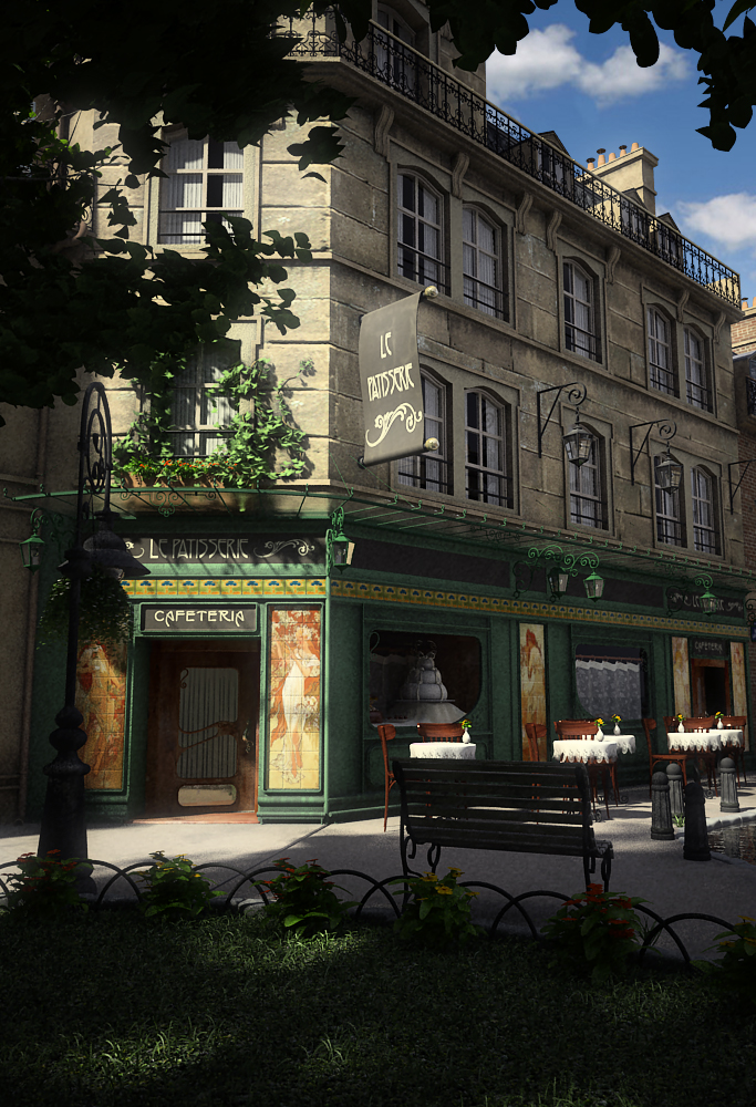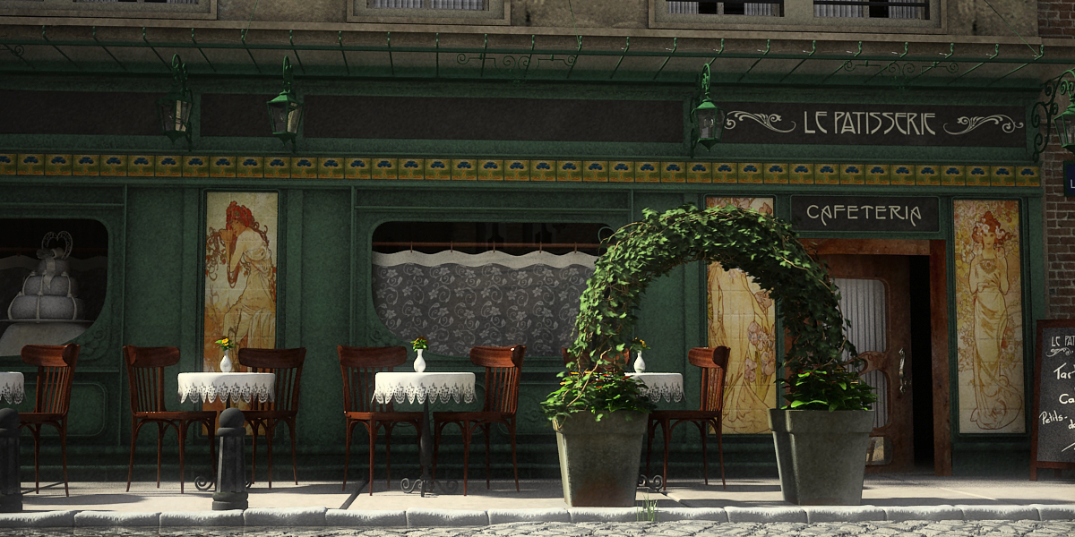 Fui buscando diferentes referencias de la ciudad de París. Quería que tuviera un estilo art nouveau (me encanta). Para la pasteleería utilice como referencia en un restaurante francés ¨le petite zinc es muy característico de ese período, incluso por los frisos. Yo utilice 5 imágenes de alfonce mucha.