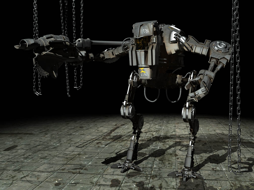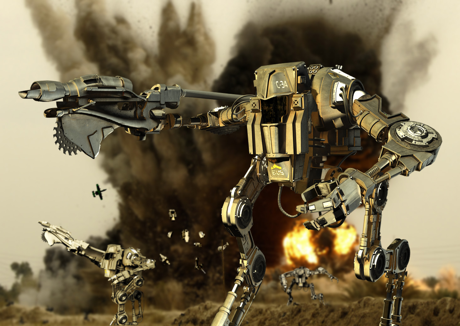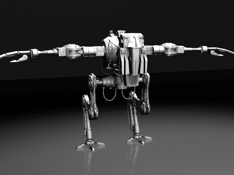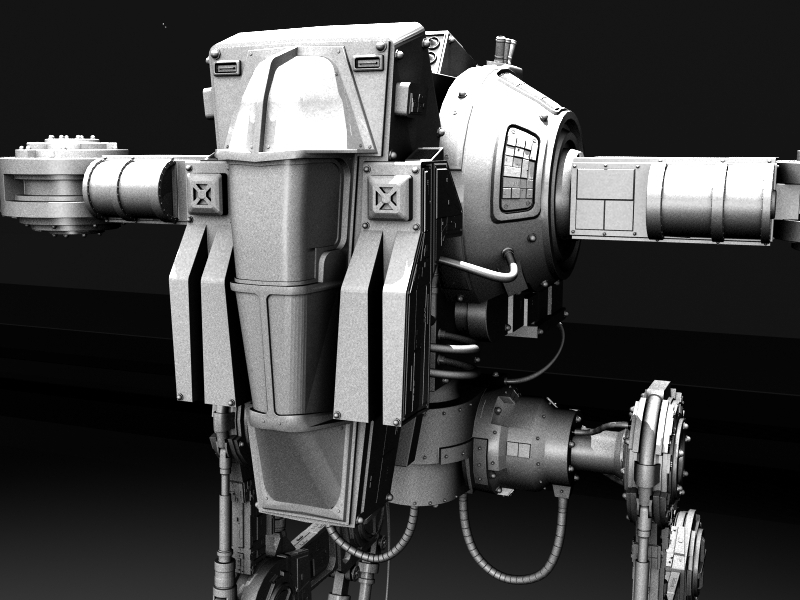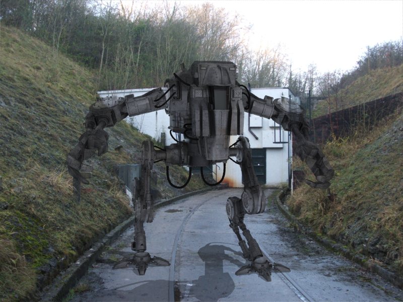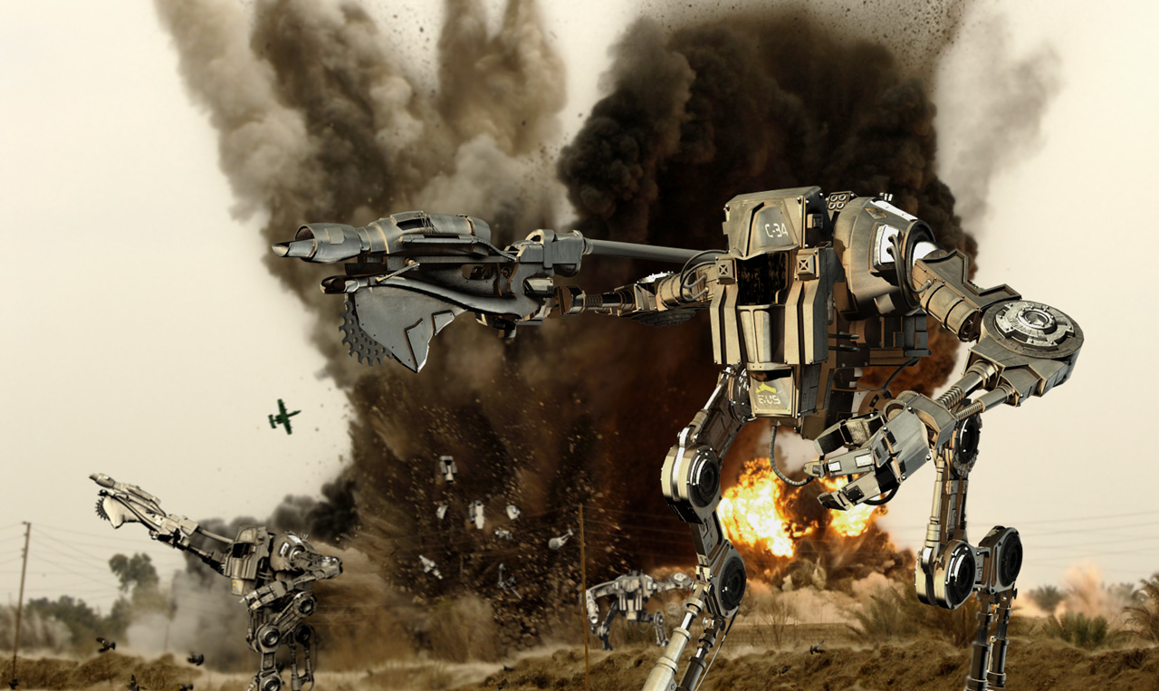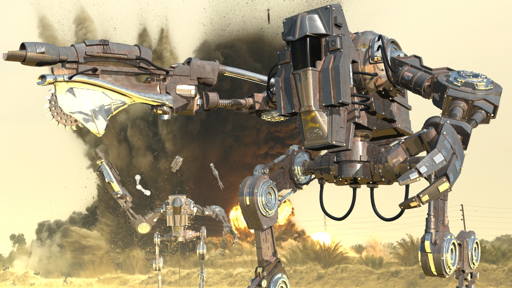 El modelo está muy bien, pero creo que tiene un desenfoque excesivo la imagen, es decir no se aprecian diferentes planos de desenfoque dependiendo de la distancia, y está casi igual de desenfocado el móntículo de tierra que está justo detrás del robot en primer plano, que el robot más alejado.