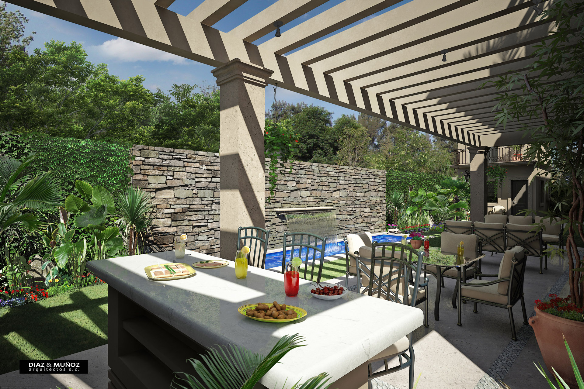 Gracias por sus comentarios, realmente aprecio su opinión, así de rápido, porque debo seguir con mis labores, les puedo decir que está hecho en 3d max9, Vray, y un poco de Photoshop para los retoques, la vegetación es una mezcla con plantas en 3d y 2d colocadas en Adobe Photoshop, para no demorar el render.