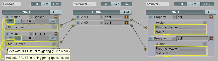 en los sensores de tipo mouse y con mouse over activado debemos presionar en la línea de puntos primera que es la activación de verdadero, y en la segundo sensor, la línea segunda que es la de falso. Y en los Actuators, les vamos a poner un nombre (activación) y al primero un 1 en el valor y al segundo un cero.