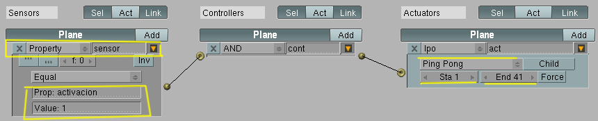 Ya por último, vamos a colocar un sensor de tipo property, al cual lo que le indicamos es que cuando se produzca una propiedad llamada activación y con valor 1 ponga en marcha el ipo que le indicamos, que comienza en 1 y termina en el 41.