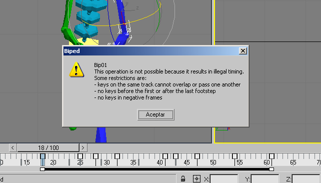 Estoy haciendo un cíclo de correr de un bíped, para seguir después con una animación más compleja que tenía prevista. Mis únicas ayudas son el help de 3ds Max, la biblia del 3ds Max 8 y algún que otro tutorial. Debería ser más que suficiente, pero la cosa se para cada poco.