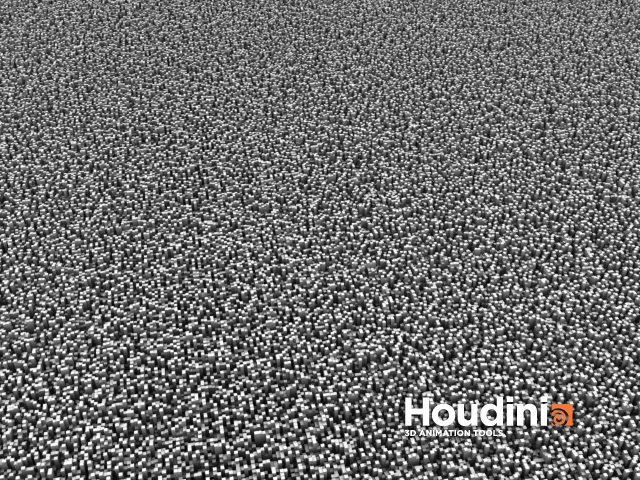 Buenas. Pues ayer estuve haciendo pruebas con el nodo instance para ver cuánto peso soportaba. La verdad es que no estuvo mal. Os adjunto la escena final, son 1.000.000 de cubos de 5 caras (10.000.000 de triángulos) (la inferior la quité por razones obvias) con material Occlusion, una luz direccional y render RayTrace con mantra.