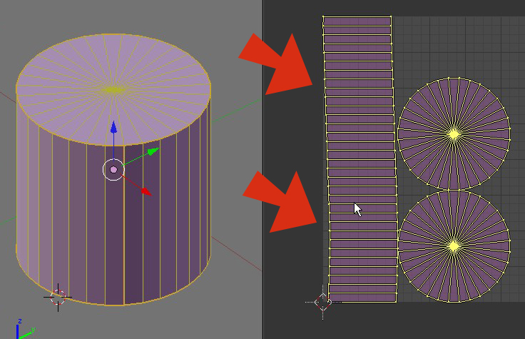 Como las tapas de los cilindros están muy juntas con el desarrollo de altura pinchamos dos veces seguidas en Sync UV and Mesh selection, que es un icono de un cuadro con un punto en cada vértice, para que se nos abra UV Island select mode un poco más a la derecha, que es un triángulo con un punto en cada vértice y que nos permite seleccionar y mover las tapas individualmente y las posicionamos donde queramos.
