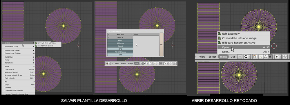 Una vez acabado, lo llamamos desde Blender en la ventana UV image editor persiana image opción open.