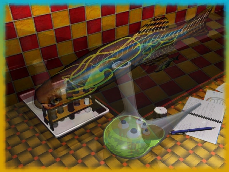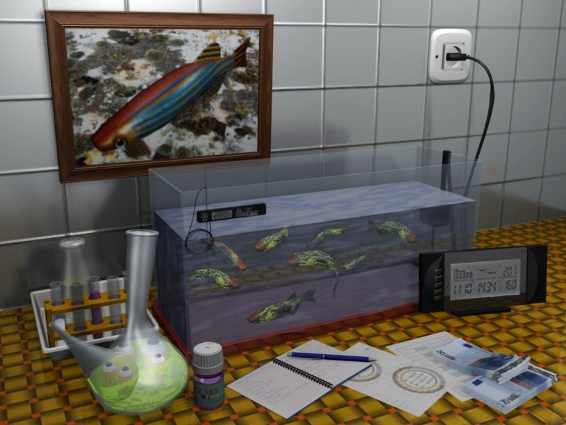 -En primer lugar trabajaría más el tema de texturas. Fíjate bien en la textura de la mesa donde apoya la pecera: ¿es adecuada? ¿otra textura enfatizaría más tu idea de laboratorio clandestino donde se hacen experimentos de ese tipo?