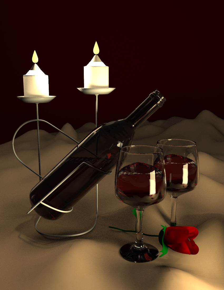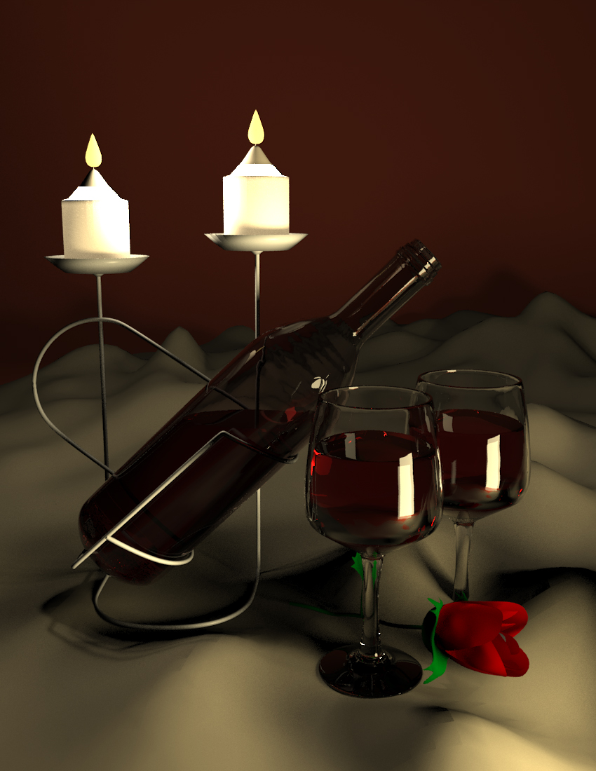 Ya me estoy manejando mejor con el Yafray. Les pongo la escena con solo las luces y con los materiales, para luego ponerle las texturas que es lo que me faltaría, pero quisiera escucharlos a ustedes primero, algunas cosas son modeladas en Blender como la tela y la rosa y el candelabro y otras en Wings según la nescecidad. Otra cosa no sé cómo hacer las llamas de las velas, hice lo que ven por mientras tanto, pero deseo toda la ayuda posible.