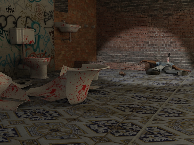 Hola, me gustan este tipo de escenas cuando quedan bien finalizadas, el planteamiento me gusta, pero pienso igual que Cafrerato, todo lo que ha dicho lo comparto, y añado que las baldosas aparte de estar partidas no están a una escala real, y que la pica y los mandos de lo que se supone que es el plato de ducha están excesivamente altos. En la parte de la bañera que queda en pie, se ve la junta del final de la textura. Fuera de los sanitarios se pierde la pista de la sangre que seguro estaría lleno. Pero creo que todo esto son cosas que sabes perfectamente solucionar, solo es dedicarle algo más de tiempo, la iluminación también podría dar más de sí, pero todo es ponerse.