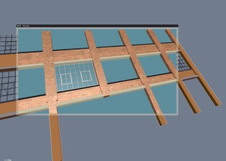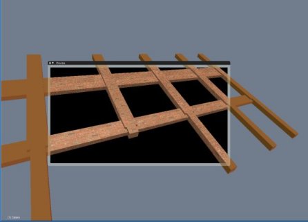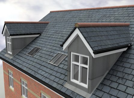 Cuando añadimos objetos creados anteriormente, puede ser útil utilizar un duplicado de tus alzados de edificios importados en dxf como una plantilla para ajustar tus objetos añadidos con el fin de precisar su localización. En el siguiente ejemplo, he utilizado la plantilla para localizar el dosel y sus soportes de las puestas de entrada y las posiciones de la ventana abuhardillada en el tejado.