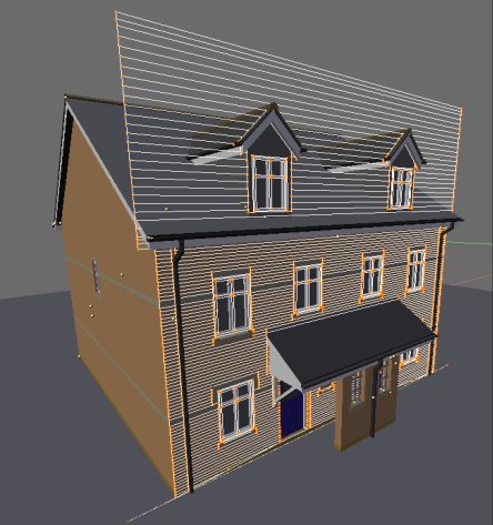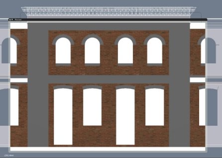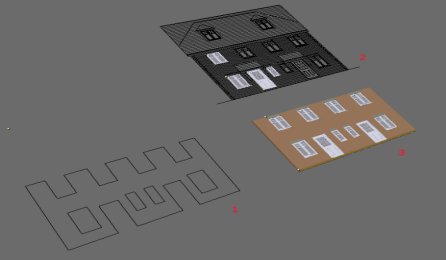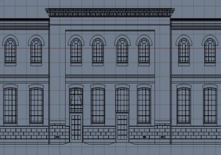 Los alzados de puertas y ventanas podrían entonces ser añadidos desde archivos blend a las aberturas. Otros elementos arquitectónicos pueden entonces ser trabajados para completar el alzado. Posiblemente un perfil de tejado/alero/canalón importado desde archivos CAD y extruido a todo el edificio dará una línea perimetral de tejado que esté lista para comenzar la construcción de la inclinación del tejado, etc. El script mesh2curve puede ser usado de nuevo para convertir mallas a curvas para extruir a lo largo de un camino.