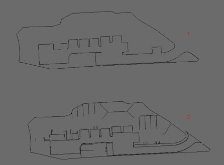 A continuación utiliza el script mesh2curve sobre cada una de las líneas perimetrales para convertirlas a curvas cerradas, dando relleno sólido para definir tus áreas. La malla (1) que figura a continuación es el perímetro para los jardínes. La malla (2) era la importación de una localización completa, pero he estado moviendo los bordes de las mallas del modelo hasta la localización final y a continuación la he modelado en 3d. El modelo de la localización final se basó en las curvas generadas a partir de la malla (1) por el script mesh2curve.